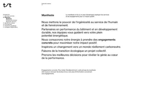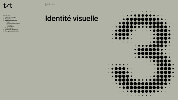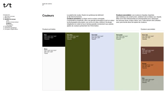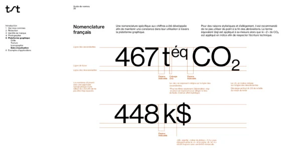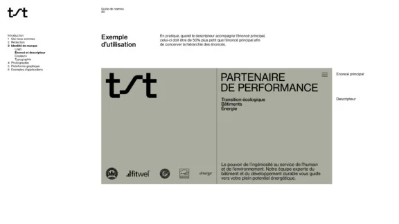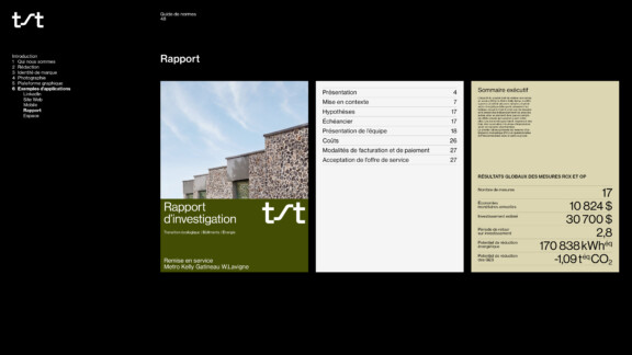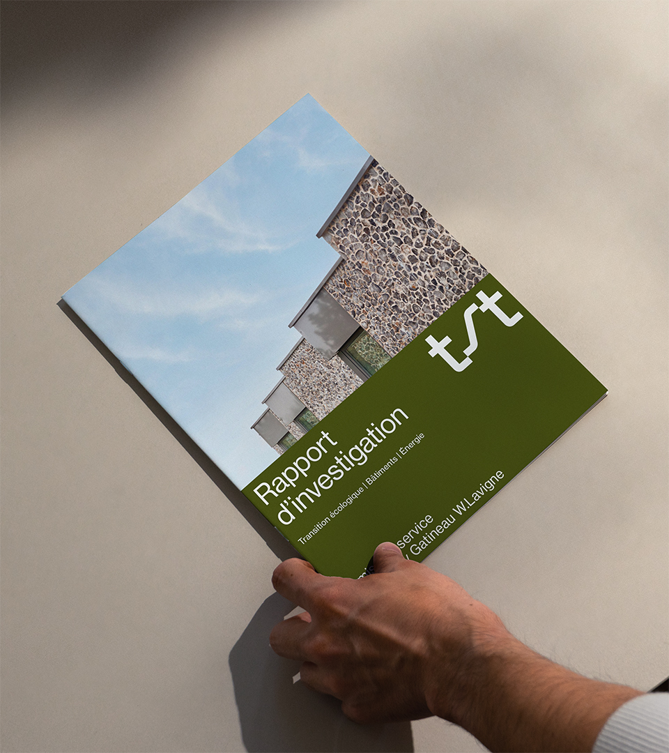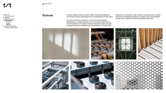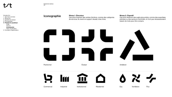 La palette de couleurs est en symbiose avec les infrastructures et l’environnement. Dans les déclinaisons graphiques, les mouvements multidirectionnels sont utilisés pour illustrer de manière plus tangible l’énergie—la chaleur, le froid, le vent—sur laquelle les services de TST ont un impact. Une iconographie a également été développée dans le but de valoriser, entre autres, les trois principaux services, soit évaluer, positionner et améliorer.